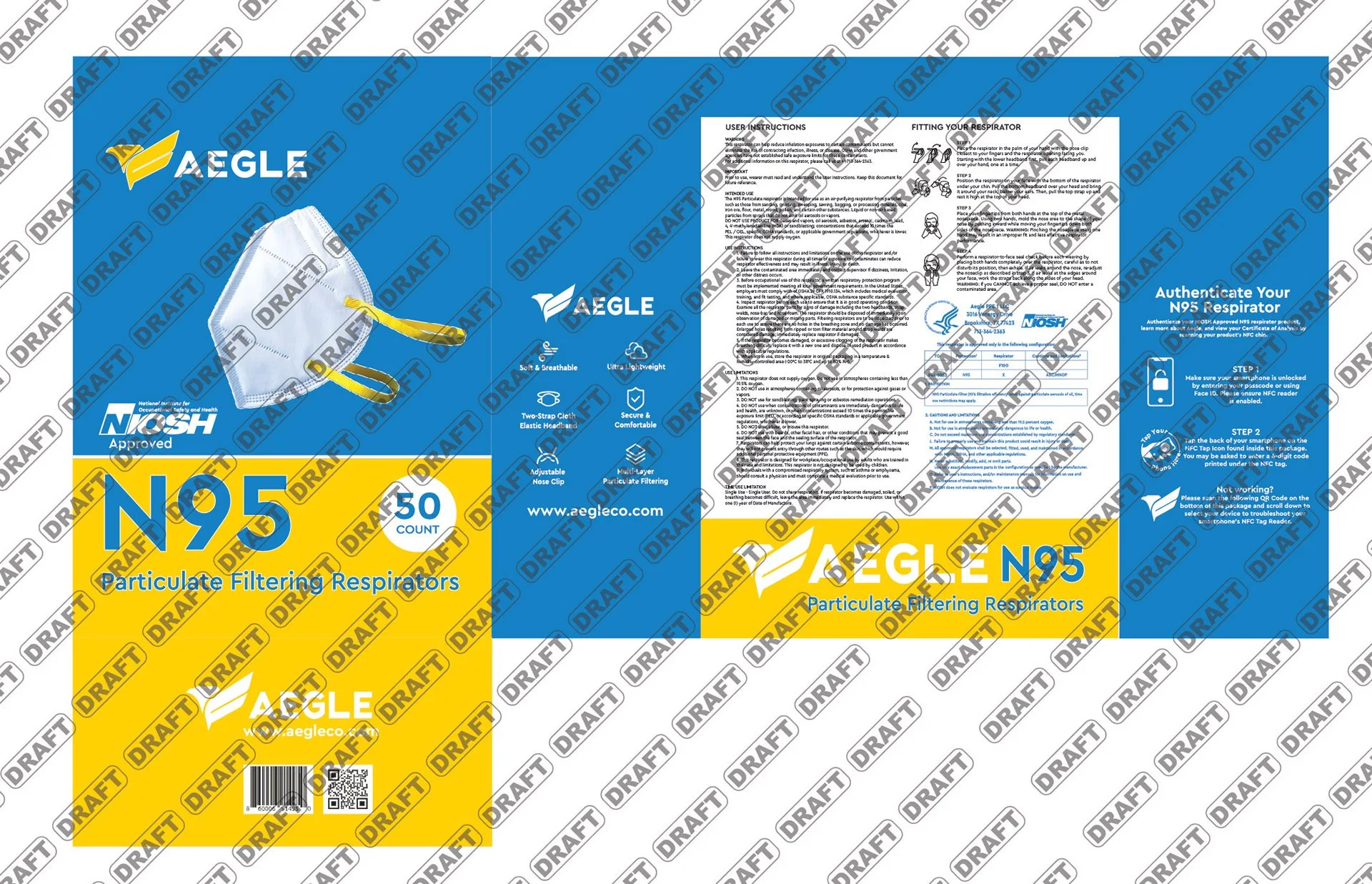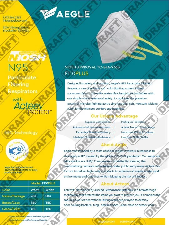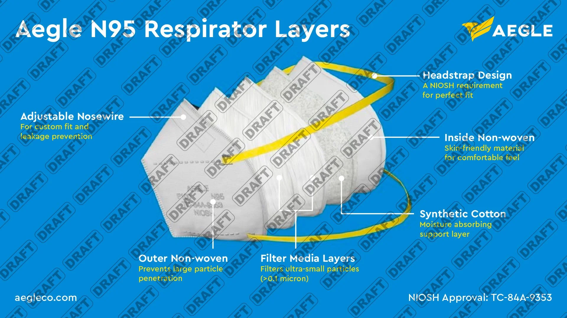 One page infographic informing Aegle customers of the breakdown of their N95 mask and its five different layers