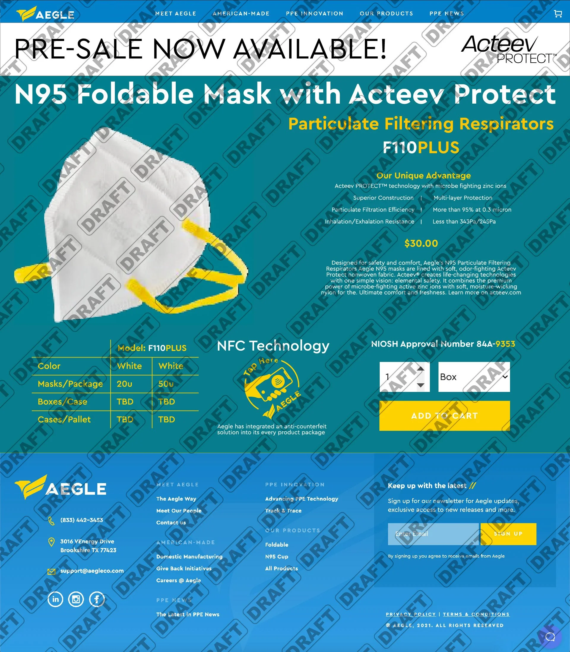 Pre-Sale launch page for the Aegle website, informing customers of the new N95 foldable mask with Acteev protect